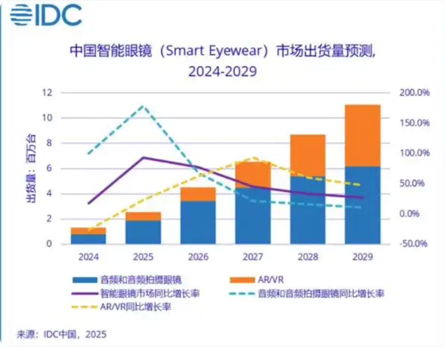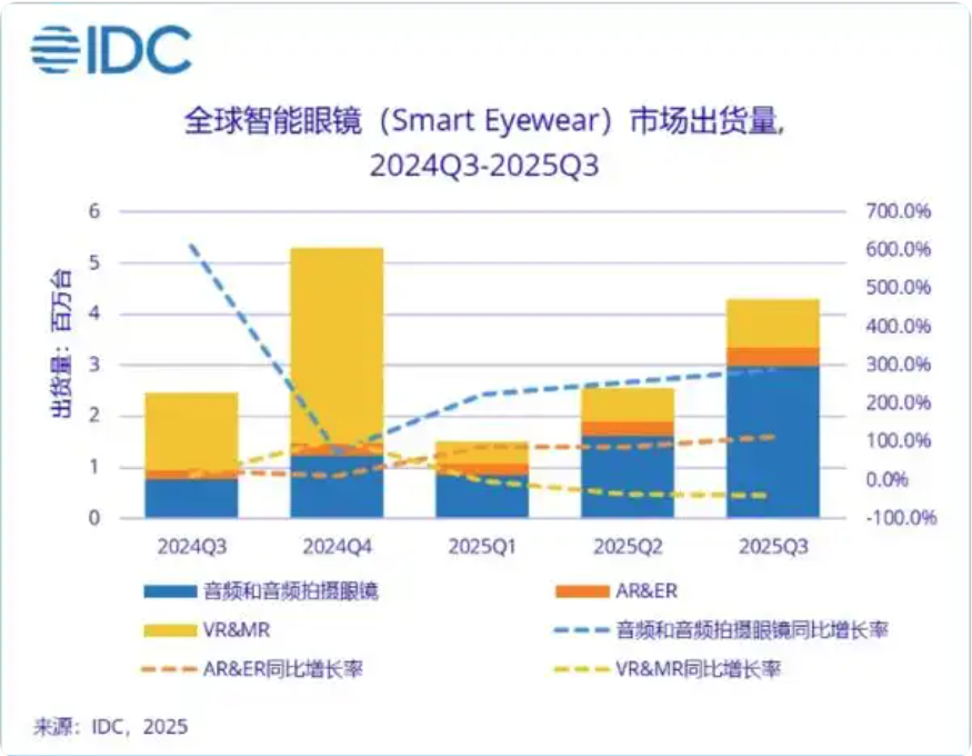 根据国际数据公司(IDC)最新发布的《全球智能眼镜市场季度跟踪报告》显示,如今,智能眼镜的市场结构性正在经历显著变化。从全球视野看,音频与音频拍摄类眼镜出货量激增287.5%,成为主要增长引擎;而AR/VR设备出货量则同比下滑23.2%。具体在中国市场,AI大模型与智能眼镜的融合加速,本季度中国市场官宣支持大模型的产品占比已达49.5%。